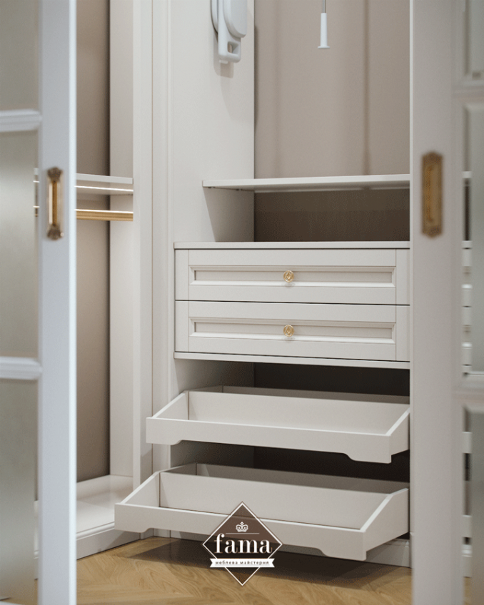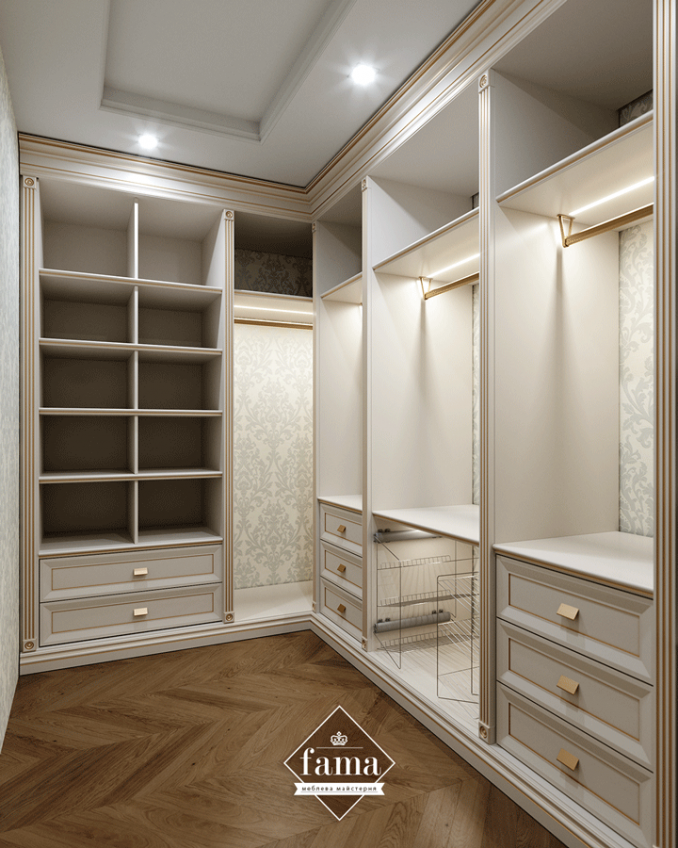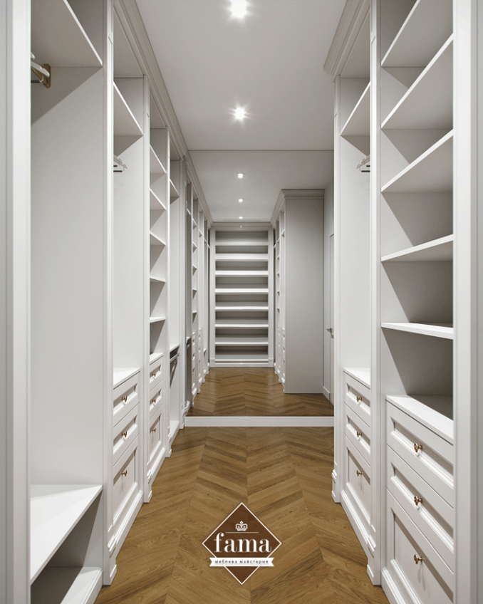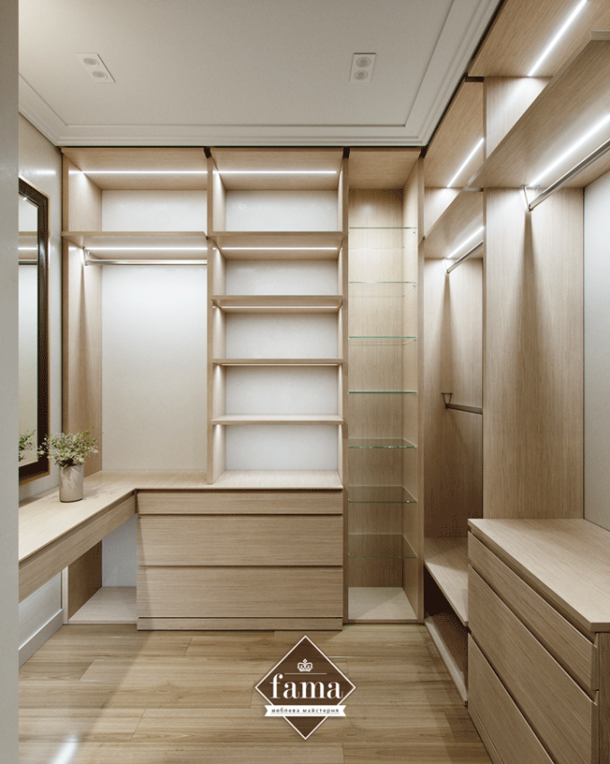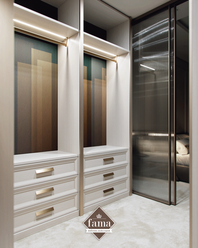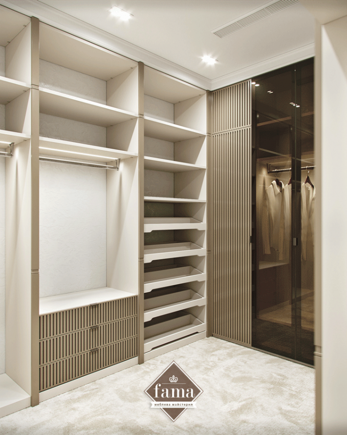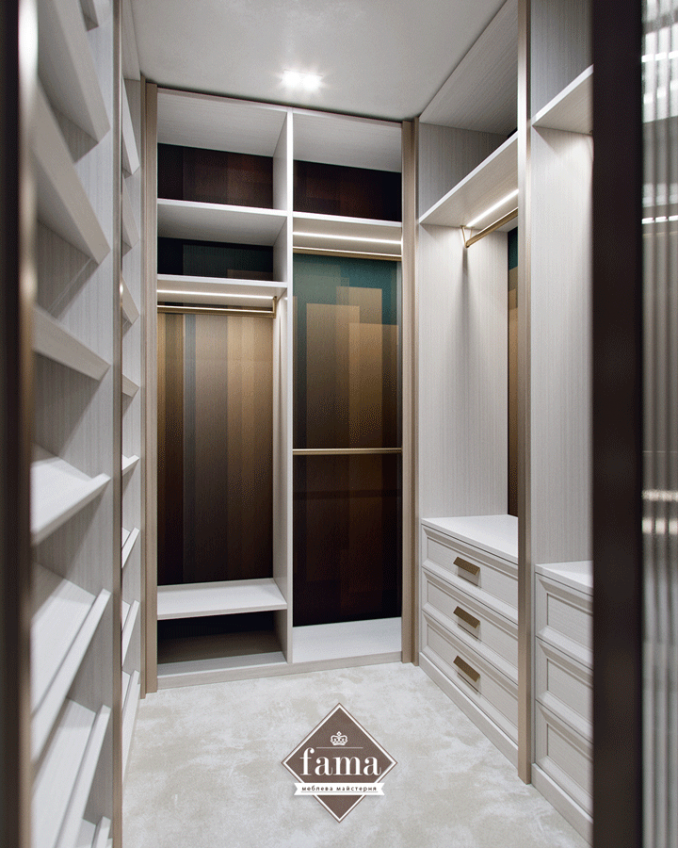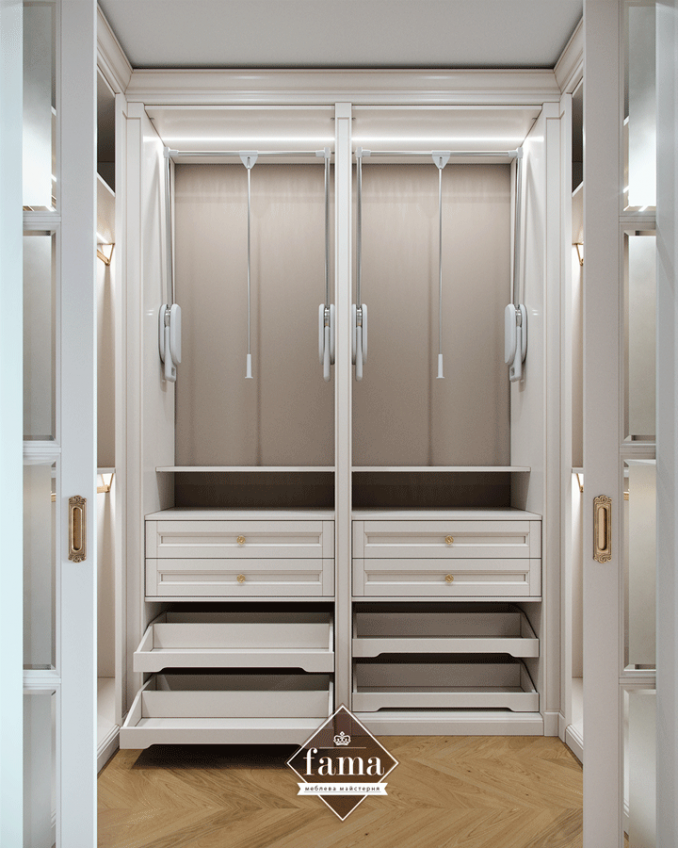 Індивідуальний проєкт гардеробної враховує стильові рішення, погоджений бюджет та систему зберігання конкретних речей у гардеробній кімнаті.